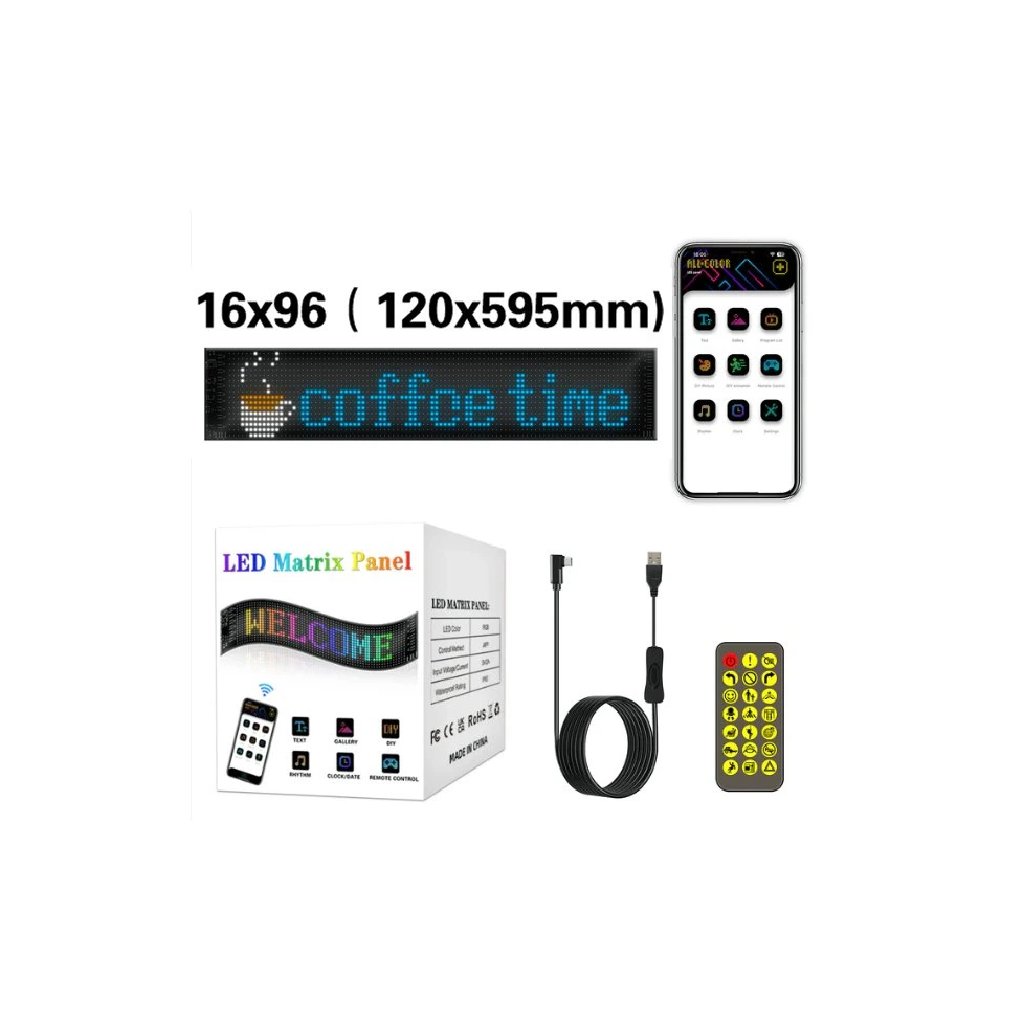 RGB LED Matrix Panel s 16x96 LED diodami. Rozměr 120x595 mm. Celý panel je vyroben z umělých materiálů, takže je vysoce flexibilní a odolný vůči ohybům. Svícení je možné ovládat přes přibalený ovladač, nebo pomocí mobilní aplikaci, kde je také možné vytvářet své vlastní nápisy a designy. Napájení pomocí USB, kabel součástí balení.