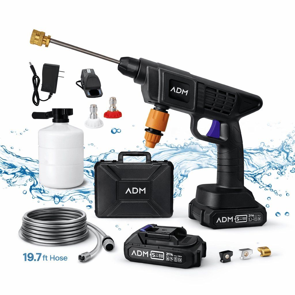 AKU tlaková myčka ADM – 30 bar, mini bezdrátová, 2× baterie, černá, kompaktní čistič pro auto a zahradu