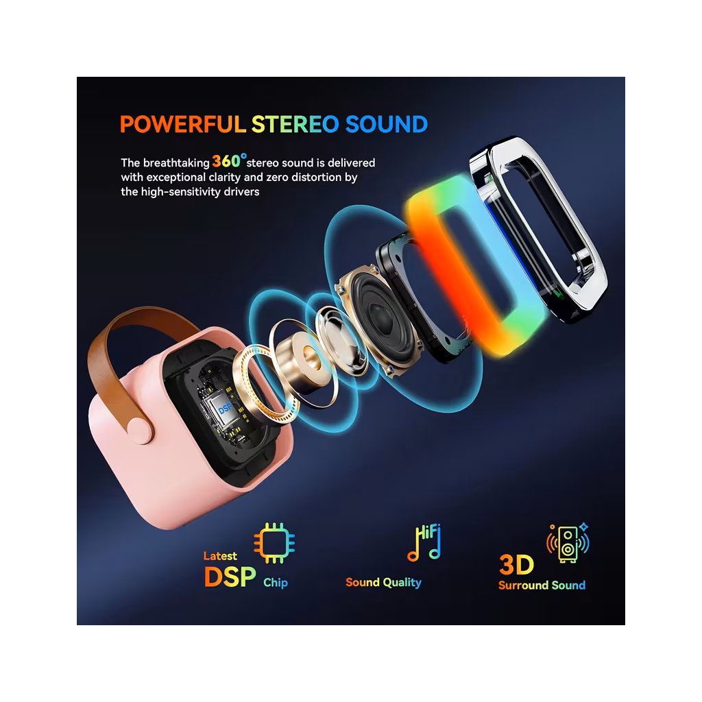 Přenosný reproduktor nabízí skvělou kvalitu zvuku a funkce Bluetooth, vstup pro karty TF (microSD) a konektor AUX umožňují snadné připojení různých zařízení a zajišťují tak naprostou svobodu při používání sady.
